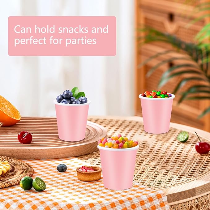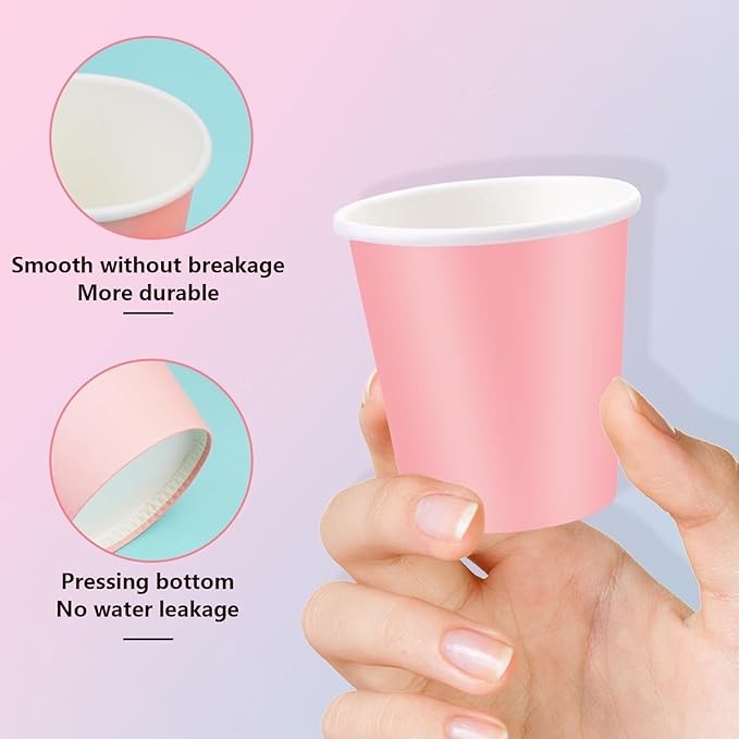 - 150 Pieces in Total:Pink little paper cups can hold 3 oz. They're available in convenient packs of 150, a large number is more affordable and beautiful.3oz small Pink paper cups are perfect for bathroom cup,supermarket trial cup,snack cup for birthday party and so on.