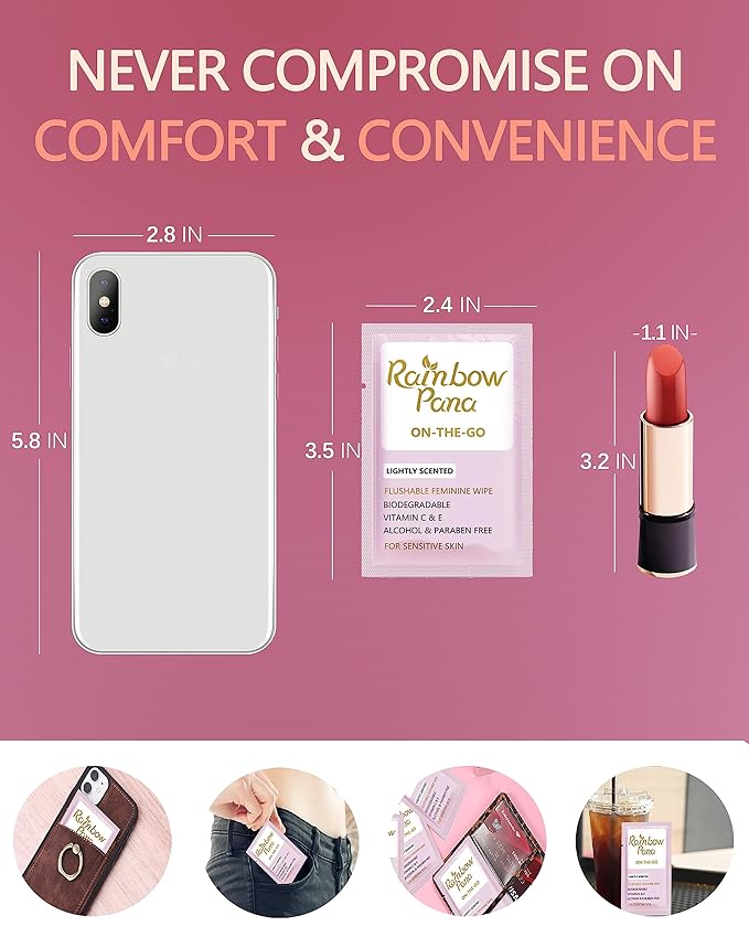 - [ Larger, Thicker Wipe in Smallest ON-THE-GO ] Individually wrapped wipe measures 7.9 x 5.5 inches while the Discreet ON-THE-GO package in 3.5 x 2.4 inches. Women’s dynamic lifestyle: school, work, gym, hanging out with friends, or traveling the world, RainbowPana Feminine Flushable Travel Wipes are always the perfect addition to a purse, backpack, or glove box. Discreet yet Stylish to share! Caught in unexpected moments? Girls help Girls!