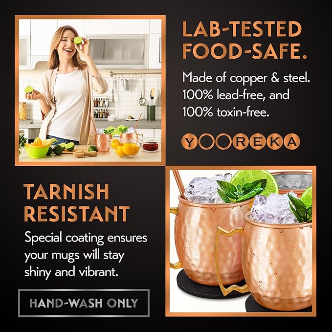 - ✅ Lacquer Coating to Preserve Shine: Each copper stainless steel mug is coated with safe, food-grade lacquer inside and out that makes it tarnish resistant. So your mugs stay looking lustrous over time.
