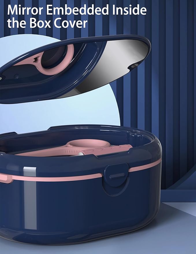 - 【Humanized Design】Unique denture bath case with drain tray, allowing you to quickly and easily lift out your dentures, retainer, mouthguard, or nightguard without touching your cleaning solution. The denture case attached mirror is a nice helper to keep you in perfect state all the time.