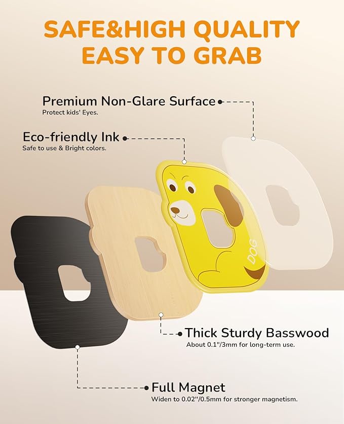 - Design for Kids:Bring kids a better game experience, we design the letter size of 2.36''*2.5''*0.14'' with cute animal design, larger size and suitable thickness. The fridge magnets for toddlers use basswood interlayer, which is more convenient to grasp for little hands. The full magnet back is not easy to fall off, all for long-term use