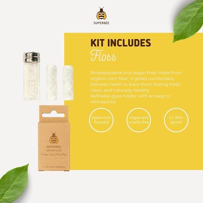 - NATURAL DENTAL FLOSS (3 spools) - Our dental floss is made from natural corn fiber, which has been infused with peppermint essential oils and coated with a thin layer of natural candelilla wax. It is vegan and cruelty free. The thin floss can be used between tight teeth and stimulates gums.