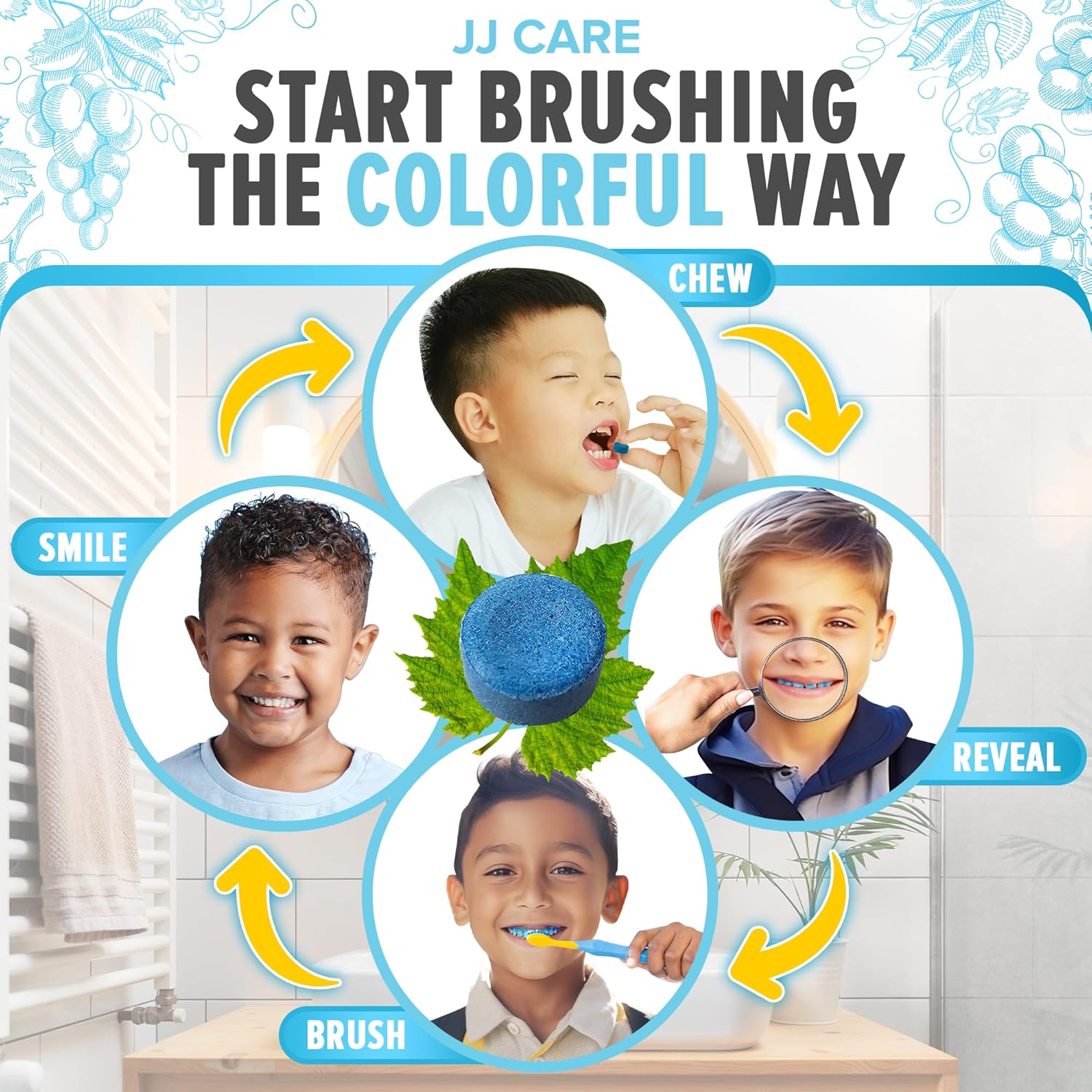 JJ Care Disclosing Tablets for Kids - 60 Count, Individually Wrapped Plaque Disclosing Tablets for Kids Brushing Teeth, Grape Flavored Plaque Remover, Dental Care for Teeth Brushing