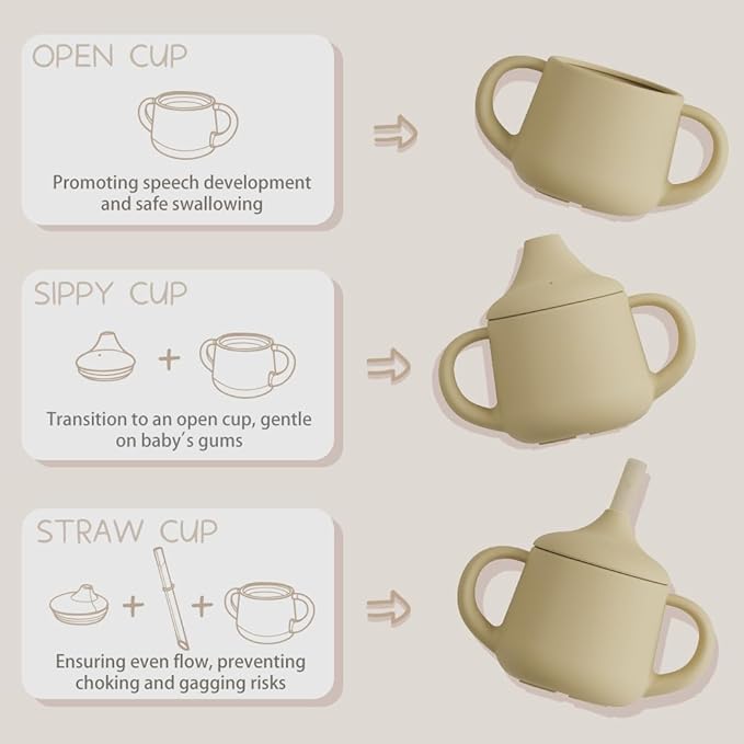 - 【Three-in-one Design (with straw + spout + open cup)】 Our baby cup features a versatile three-in-one design that can be converted from a sippy cup to a straw cup to an open cup, encouraging your baby to develop drinking skills.The open cup promotes lip closure, speech development, and safe swallowing while also preventing tooth decay. Going from a straw to independent drinking is such a huge milestone for early development, so we have designed one cup that will be there for every step.
