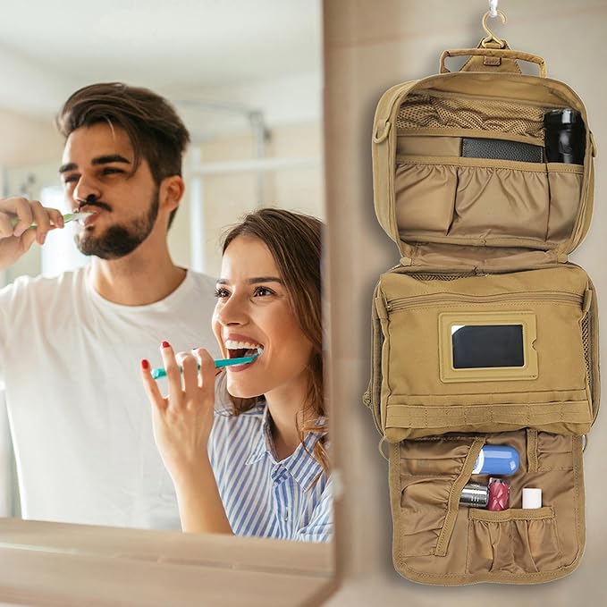 - Practical Design: This large toiletry bag has a convenient carry handle on the side; the MOLLE design of the front pocket allows you to attach pouches, water bottle pockets and accessories, and the back zipper has an organizer hook for easy toiletry bag placement