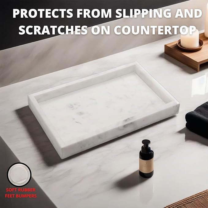 - [ NATURAL MARBLE BATHROOM TRAY ] -Premium Italian Carrara Marble Crafted from 100% natural marble with elegant veining—no resin or ceramic fillers. Each tray is hand-finished, making every piece beautifully unique.