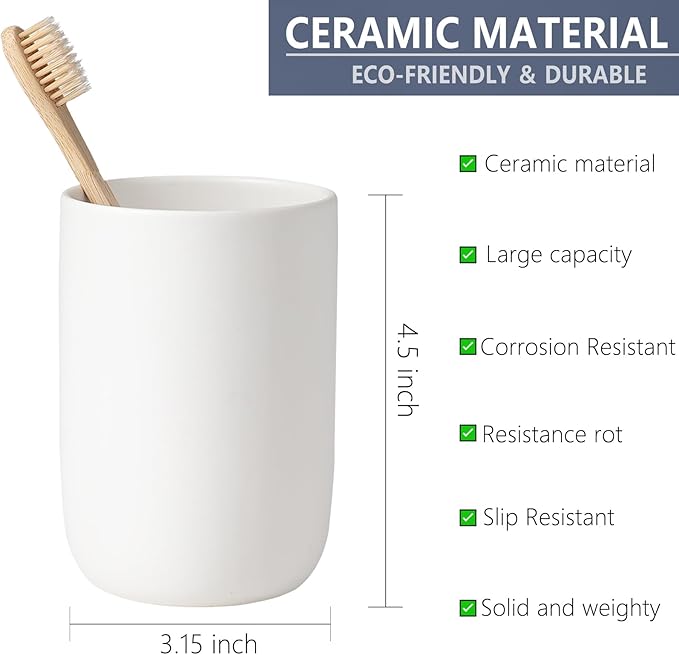 - PERFECT SIZE:This white ceramic bathroom tumbler cup save space on the bathroom countertop, easy to hold, and easy to clean. Adequate for your bathroom daily use.