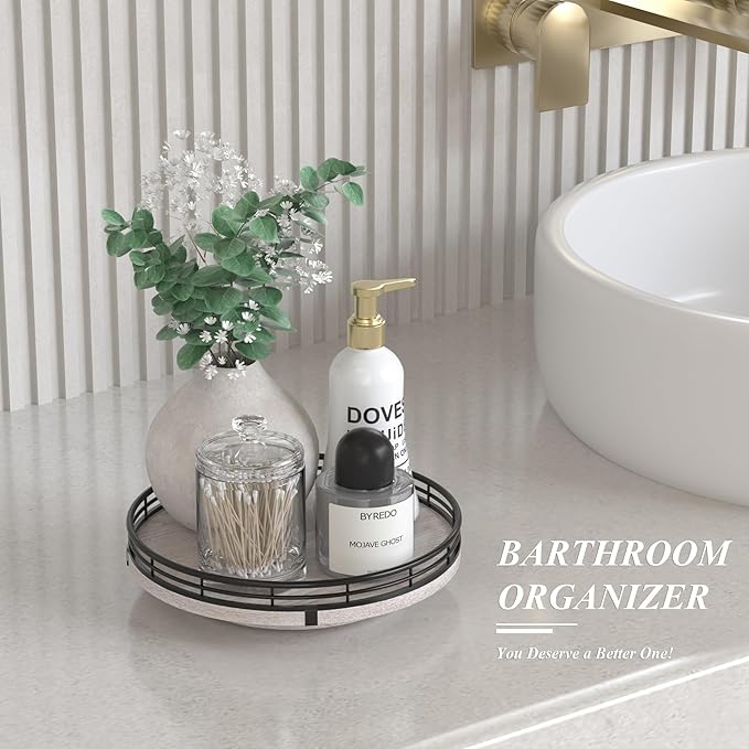 - πππππππππ πππ: This whitewashed lazy susan is enough to be used nearly anywhere, perfect in the bathroom, bedroom, laundry room, office, etc. Keep your bathroom counter organized with this bathroom tray for toiletries, lotion, washcloth, cotton swabs, soap and scrubber. Using a bathroom vanity tray to keep all your daily skin care and makeup. On the bedroom counter, ideal to organize perfumes. Good idea for the office desk and craft room to organize. Keep your coffee stuff perfect at your coffee station.