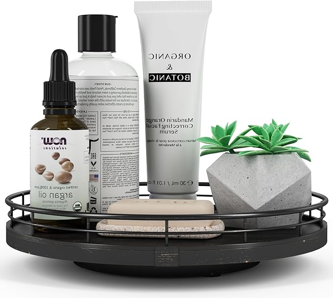 10" Oak Bathroom Vanity Tray Turntable for Perfume Candle, Round Wooden Decorative Tray for Kitchen Sink Countertop Organizer, Bathroom Counter Organizer for Skincare Makeup, Farmhouse Black Gold