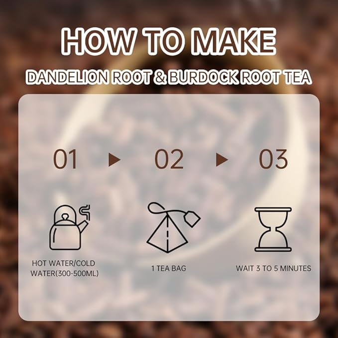 - 【Special Note】: Dandelion and burdock tea is not for everyone. Because it has the effect of promoting digestion, it is recommended to use it with caution if your gastrointestinal function is weak, because the ingredients in the tea may irritate the stomach, causing gastrointestinal discomfort or even diarrhea.