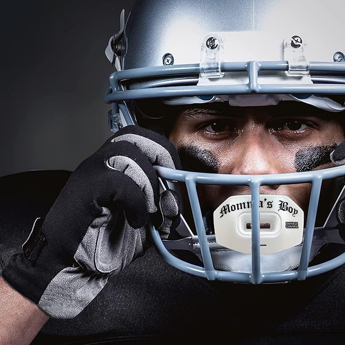 DAMAGE CONTROL Youth Football Mouth Guard – Breathable No Boil Mouthpiece, Protects Lips & Teeth, Works with Braces, Includes Helmet Strap – Sports Gear & Accessories (Momma's Boy)