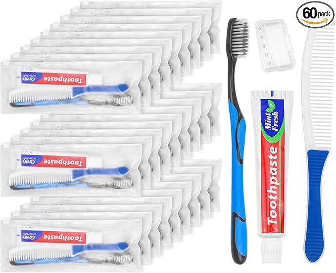 - More sets to match: our travel toothbrush set come in a set of 60. Each bulk travel toothbrush kit comes with a travel toothbrush(With transparent protective case), 45g large capacity toothpaste, hair combs. travel size toothbrush makes it more comprehensive, convenient and comfortable to use.