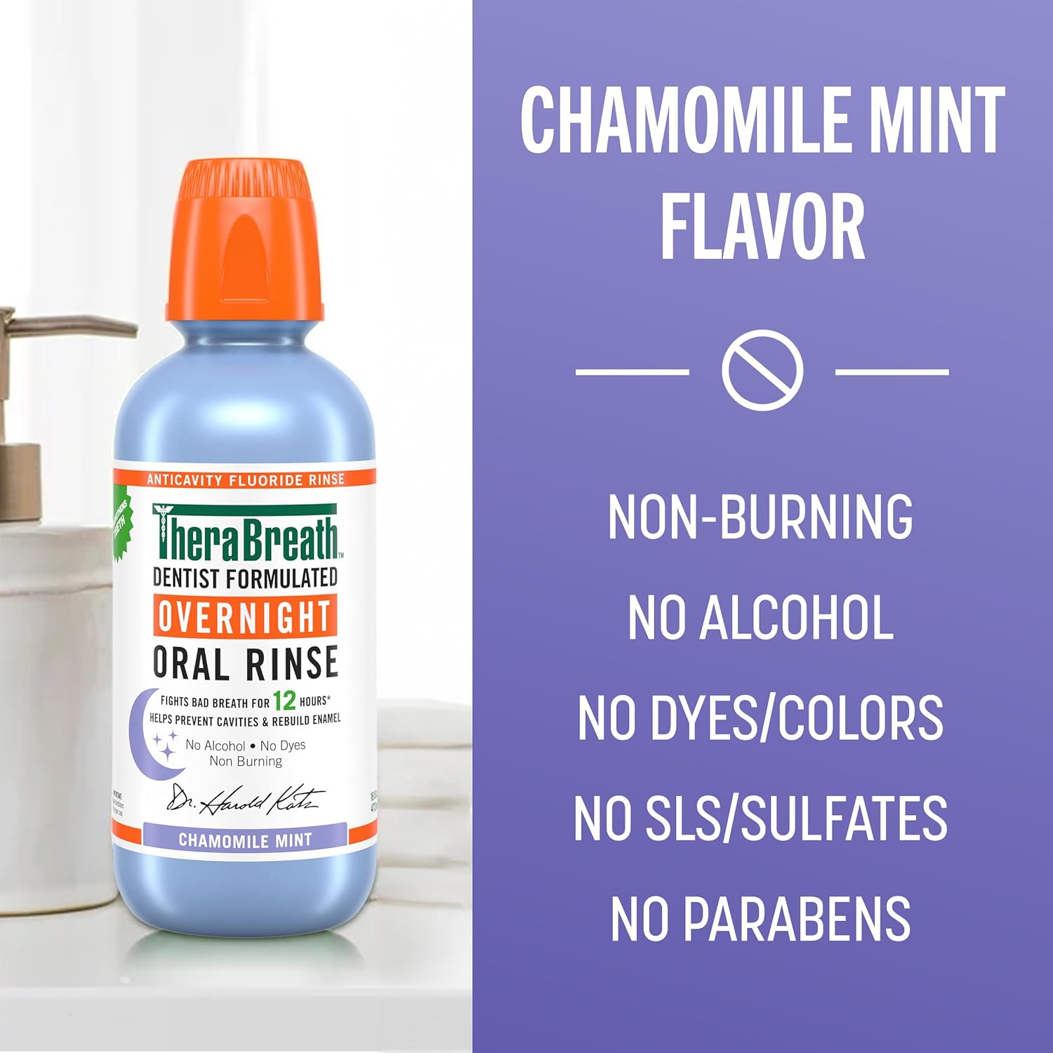 - Two 16 fl oz TheraBreath Overnight Mouthwash; Dentist Formulated; Chamomile Mint Flavor; Fluoride Rinse; Alcohol Free