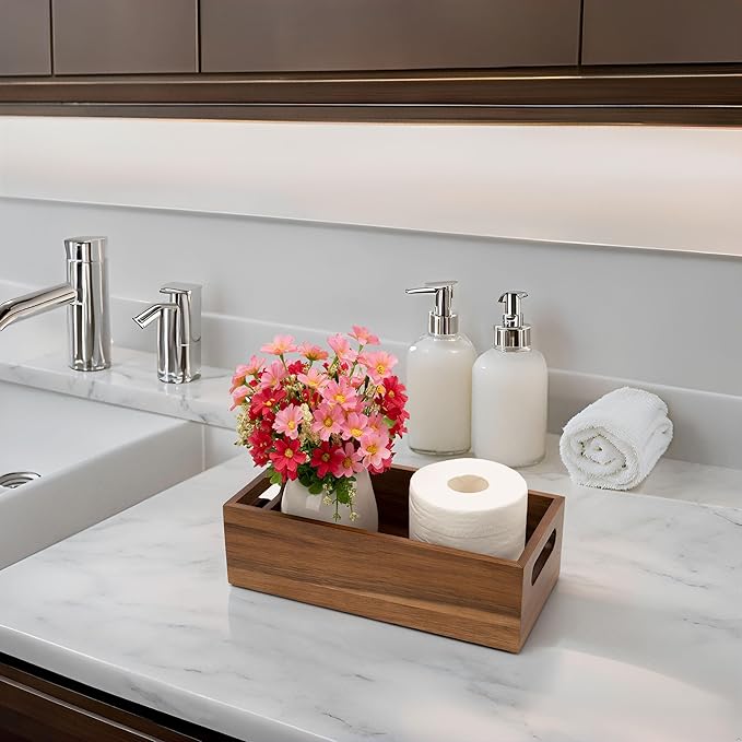 - 【Natural and durable】-Crafted from 100% natural acacia wood, this Bathroom Tray with Handles is a luxurious and natural addition to any bathroom. Its natural variations in color make each tray unique, and its hardwood construction ensures long-term durability. The waterproof and easy-to-clean surface ensures that the tray will remain in great condition for decades, making it a worthwhile investment.