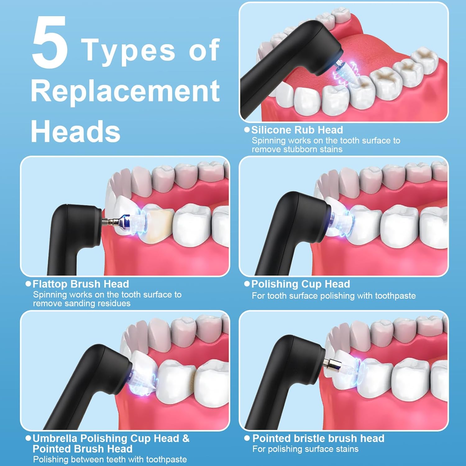- Interchangeable Brush Heads: Household electric tooth polisher come with 5 types of brush heads for effective teeth cleaning. The silicone rub head removes coffee and tea stubborn tooth stains, The flattop brush head removes sanding residues, The umbrella polishing cup head and pointed brush head are effective plaque and in between teeth stain remover, The polishing cup head for tooth surface polishing with toothpaste. Effective for daily oral care and tooth whitening