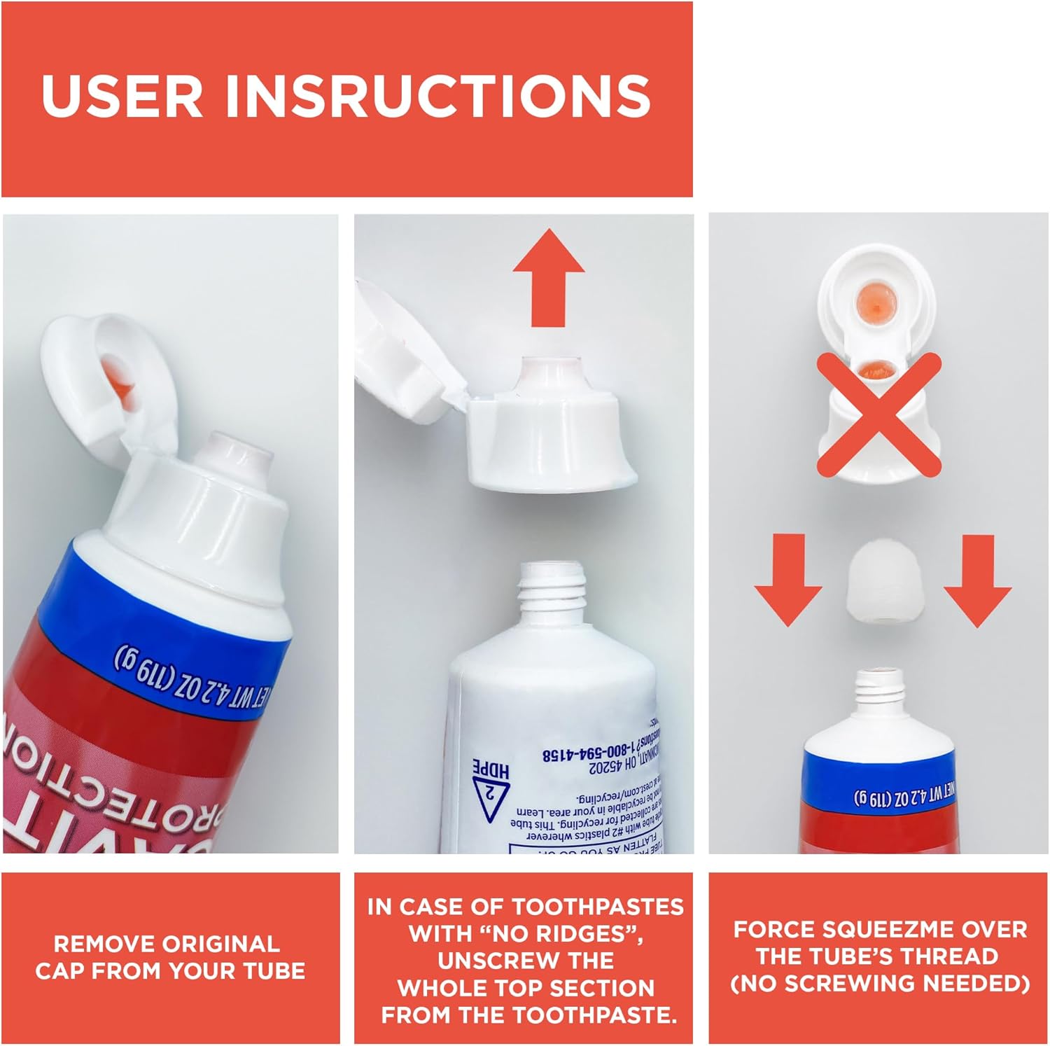 - Quick & Easy to Install: Simply remove your original cap and press SqueezMe tooth paste cap dispenser onto the tube, no twisting or turning required; For tubes without threads, just unscrew the entire top before installing