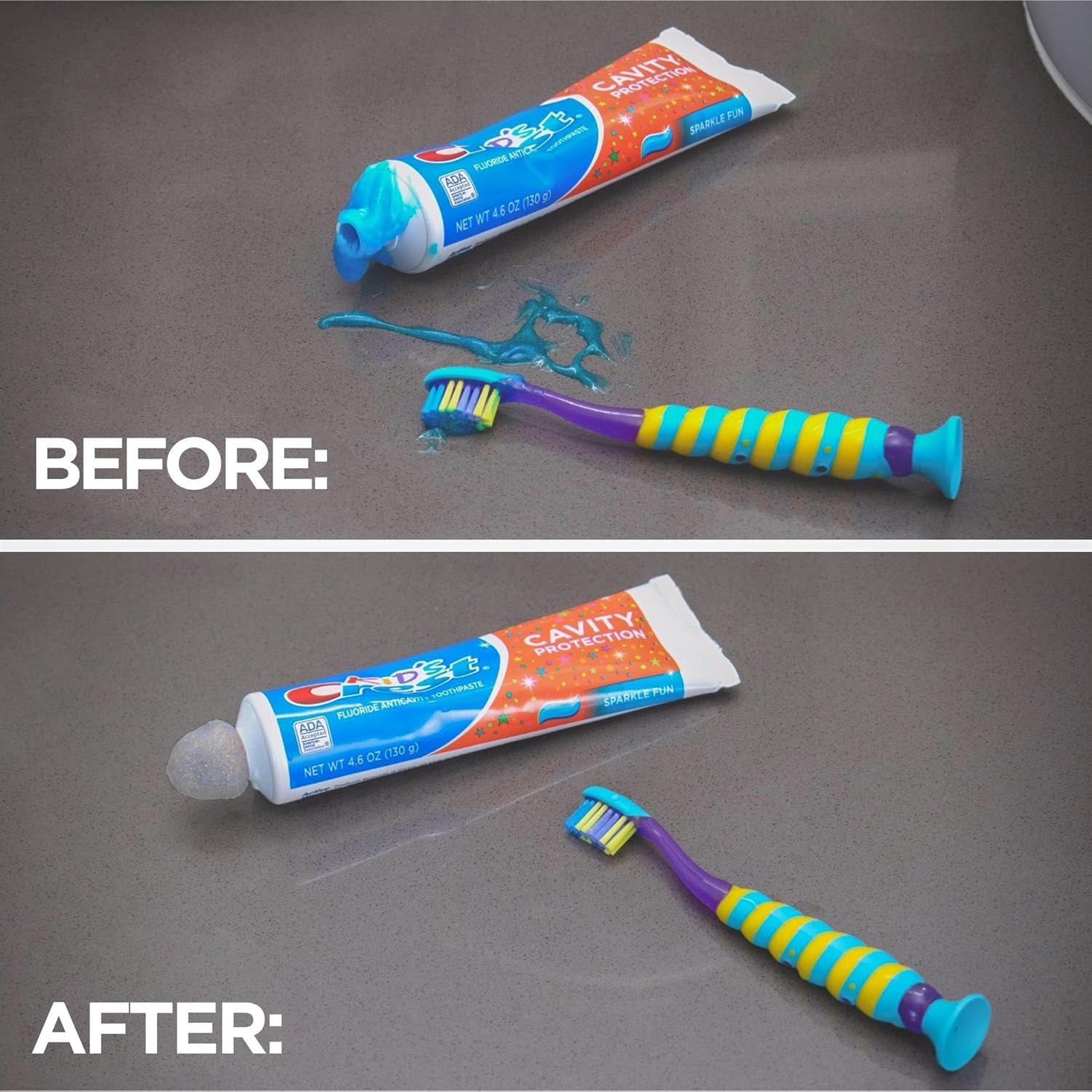 - Mess-Free Every Time: Tired of sticky toothpaste caps and messy counters? SqueezMe kids toothpaste dispenser's self-sealing silicone design keeps your bathroom clean by dispensing toothpaste neatly and automatically sealing itself