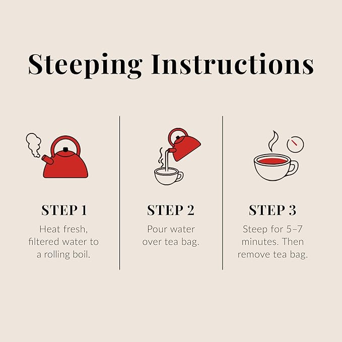 - STEEPING INSTRUCTIONS: Simply heat fresh, filtered water to a rolling boil. Then pour 6 oz of water over a tea bag and steep for 5–7 minutes. Experiment to find your favored steeping time. Remove the tea bag and enjoy. After steeping, add the used tea bags to compost or soil — they make gardens happy.
