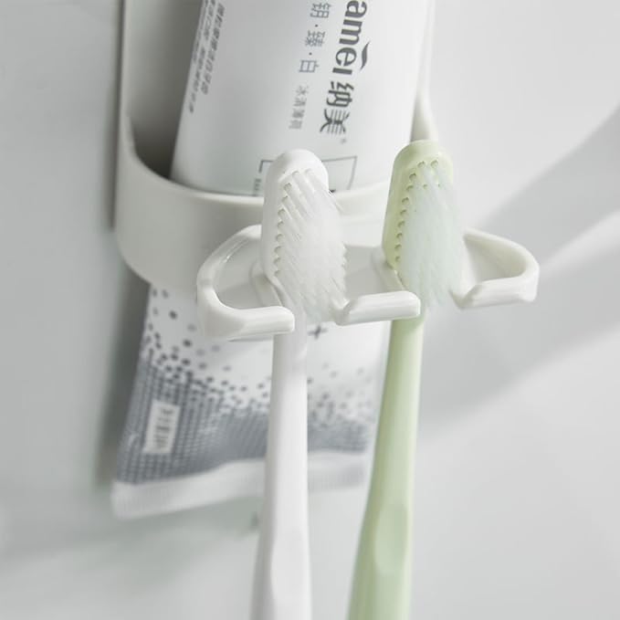 2 PCS Self-Adhesive Toothbrush Holders Wall Mounted, Water Proof Toothbrush Hook, 3 in 1 with Toothbrush Hanger Toothpaste Holder and Gargle Cup Holder for Bathroom Shower (White)