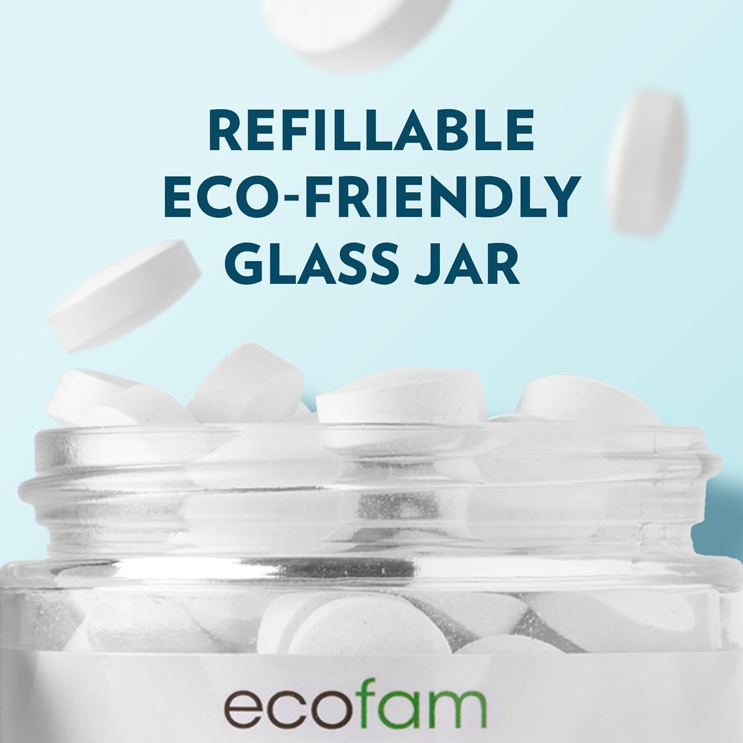 - ZERO-WASTE PACKAGING - Ecofam Toothpaste Tablets are packaged in reusable glass jars, eliminating the need for single-use plastics. Feel good about your oral care routine knowing that you're making a positive impact on the environment.