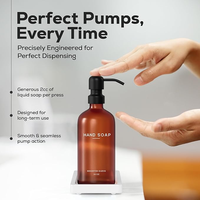 - AMERICAN DESIGN, UNCOMPROMISING QUALITY - Crafted with meticulous attention to detail, our amber glass soap dispenser set features 2 robust 16oz glass bottles, corrosion-proof 304G stainless steel pumps, and a stain-resistant ceramic tray. All designed in the USA to provide unbeatable quality and enduring style that you can trust.