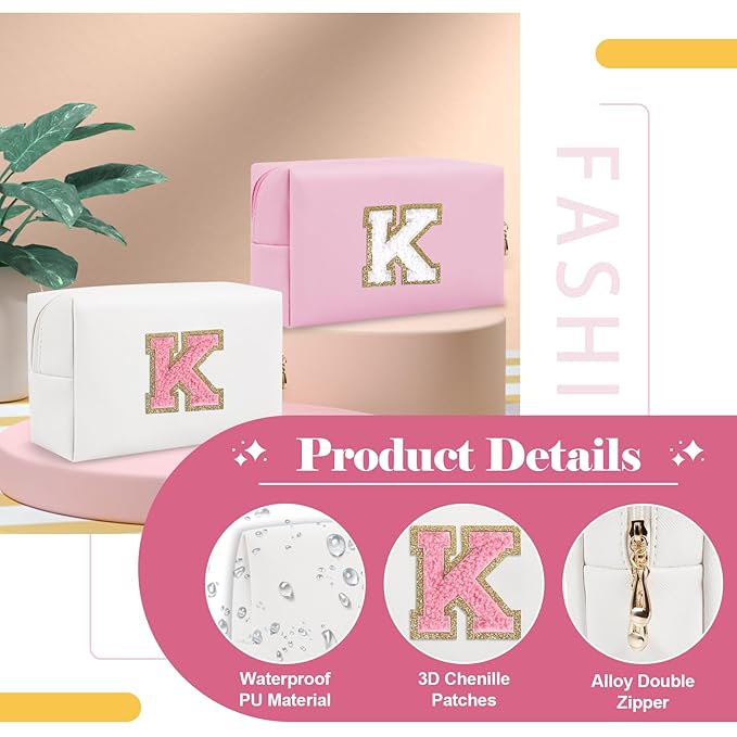 Personalized Makeup Bag Initial A-Z Preppy Patch Bag,Small PU Leather Travel Cosmetic Bag Pouch with Zipper,White Cute Toiletry Bag,Gift Ideal for Teen Girls Women Birthday Friend Mom,Letter K