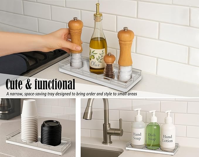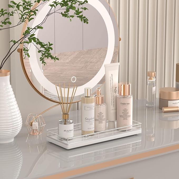 - Versatile Functionality: Elevate your daily routine with our bathroom counter tray; Neatly arrange bathroom essentials like soap, toothbrushes, cotton swab and lotions, keeping your countertop tidy; Add a touch of elegance to your dresser by using the vanity tray to showcase perfumes, jewelry, and cosmetics; Impress your guests with neatly arranged hand towels and toiletries presented on the small tray or use it as a toilet tank tray