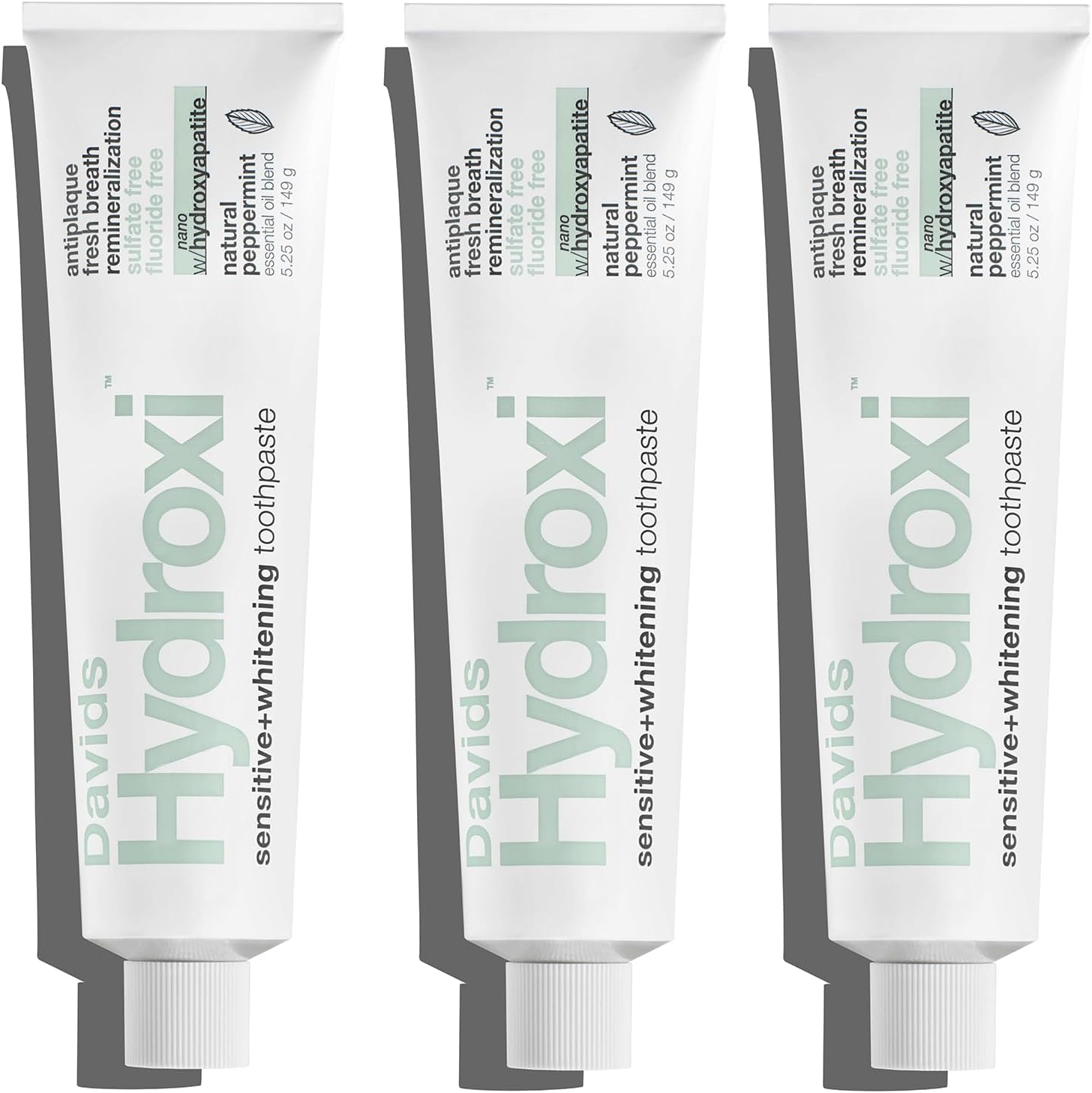 Davids Hydroxi Fluoride Free Nano Hydroxyapatite Toothpaste for Remineralizing Enamel & Sensitive Relief, Whitening, Antiplaque, SLS Free, Natural Peppermint, 5.25oz, Made in USA (3 Pack)