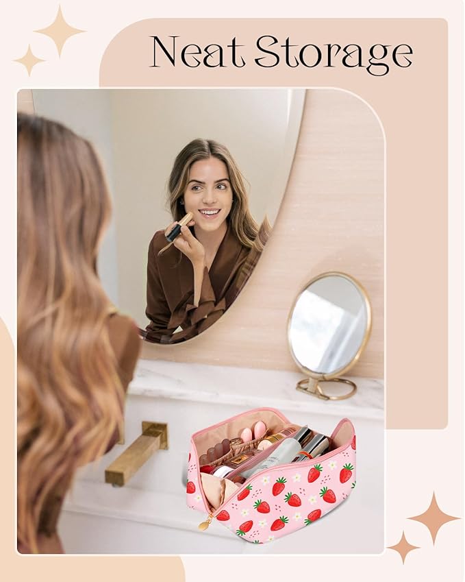 Bistup Makeup Bag Travel Cosmetic Bag Toiletry Make Up Bags Cute Women Large Capacity Big Medium Leather Strawberry Portable Teen Girls Teenage Kawaii Foldable Expandable Compact Open Flat Zip