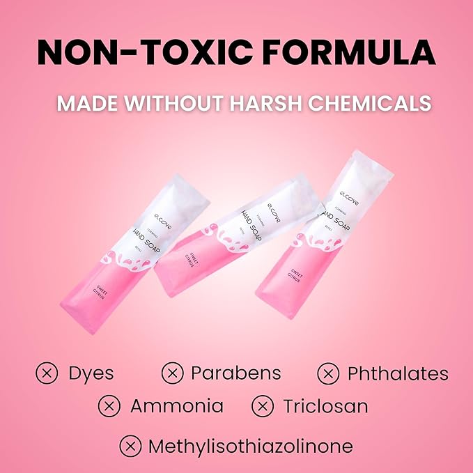 - NON TOXIC AND GENTLE: Our refillable hand soap is made with non-toxic ingredients that are tough on dirt yet gentle on your skin. Free from harsh chemicals, including Methylisothiazolinone, Chlorine, Phosphate, Triclosan, Parabents, Formaldehyde, and Dyes, making it a healthier choice for your home and the environment.