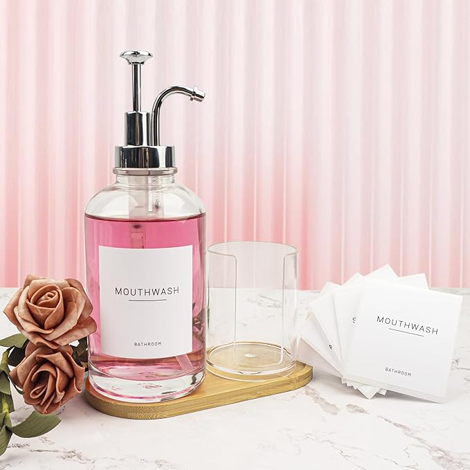 17OZ Mouthwash Clear Glass Pump Dispenser with Disposable Mouthwash Cups Holder Refillable Clear Container with Bamboo Tray, Mouthwash Labels