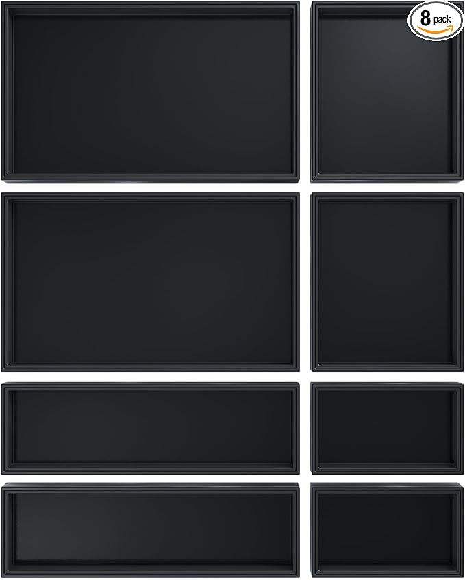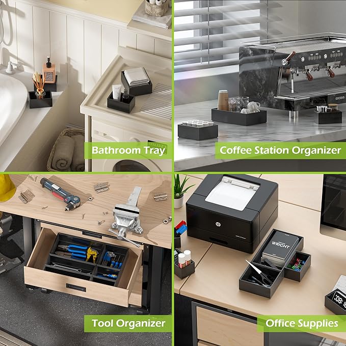 - Stackable Tool Box Organizer for Garage Organization - This black drawer organizer set contains 4 different sizes (totally 8 pcs)for meeting your different needs: 10" x 6", 5" x 6", 10" x 3", 5" x 3". With groove design, our tool box organizer can be stacked as needed. Save your desk space when using it on the countertop, and you can also make full use of the height of the space in the drawer