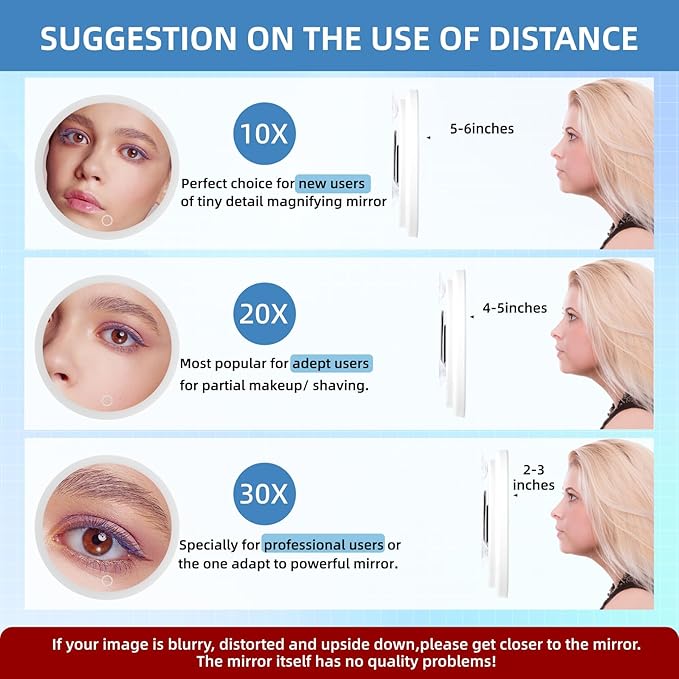 - 【THINGS YOU NEED TO KNOW】This travel makeup mirror with 20x magnification is a concave mirror, unlike flat mirrors, please hold the mirror 4-5inch close to eyes. If your image is upside down,distorted or blurry,please get closer to the mirror, the mirror itself has no quality problems. Please noted that the mirror designed for specific facial needs instead of whole face makeup.
