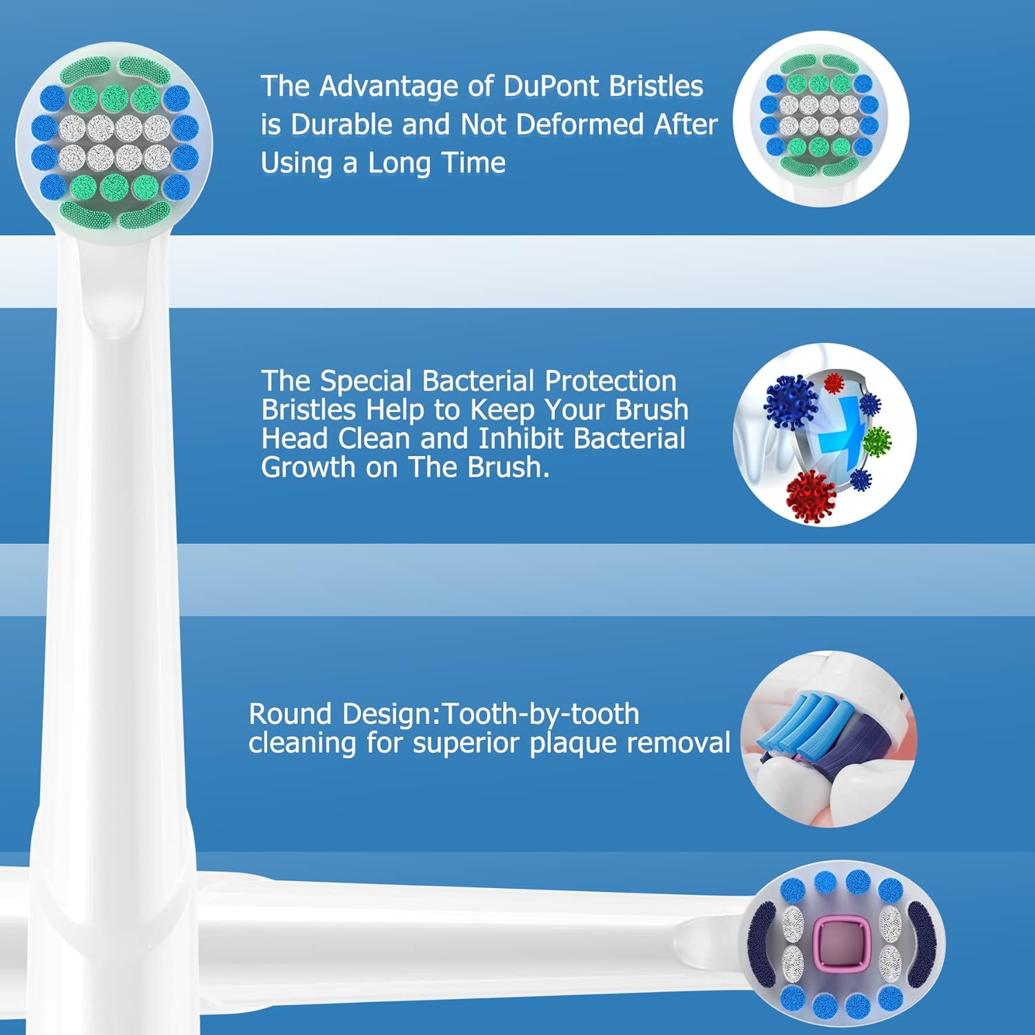 - Each brush heads have indicator bristles that can fade in the middle about 3 month later to remind you when to replace the toothbrush heads.