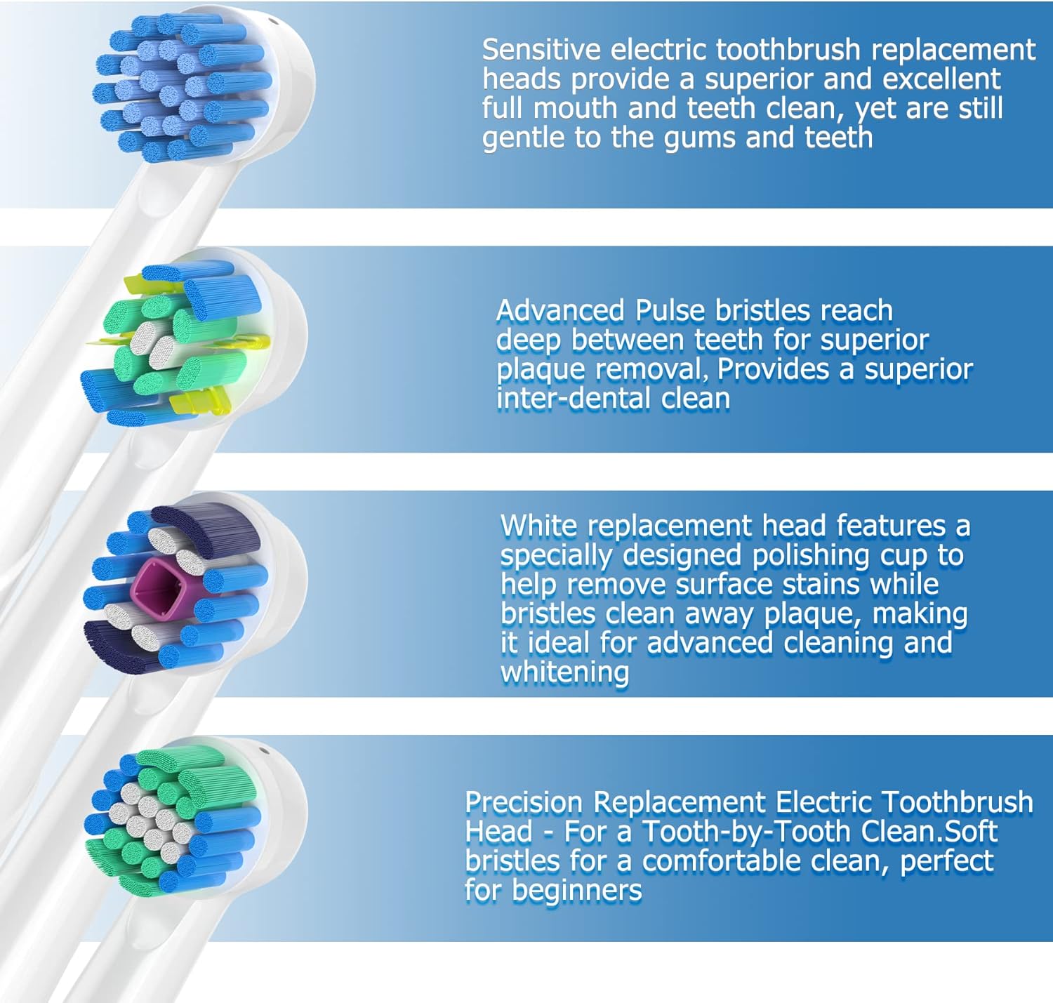 - Pack of 16 Replacement Brush Heads &Value Purchase - Included 4 floss clean, 4 Precision, 4 senstive and 4 3D clean toothbrush heads, brush heads with different functions allow you to change them at any time. Each brush Head has a different color-coded identification ring which will help you to pick up your personal brush heads so that you can share with your family.