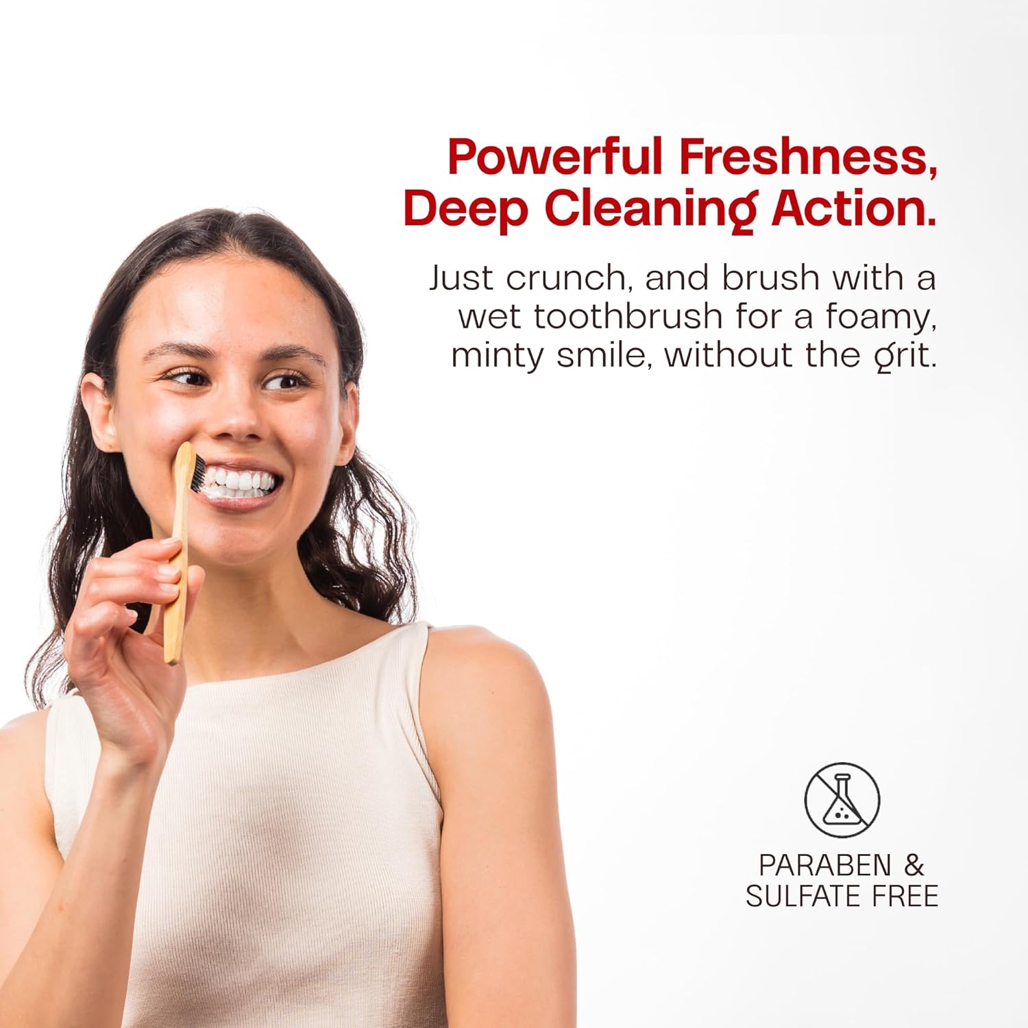 - Chewable, bite-sized tabs: No paste, no mess! Compact tablets in zero-waste, compostable packaging.