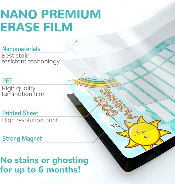 - 100% ERASABLE - By using nano premium erase film, your writings are super easy to be wiped off even after leaving them for a long time. It is reusable!