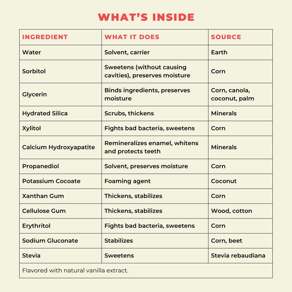 - SAFE FOR BABIES, TODDLERS, AND ADULTS ALIKE: From first tooth to full set, Happy Tooth is a natural toothpaste parents trust and kids actually love. Free from fluoride, SLS, and artificial fillers, our Vanilla Frosting flavor makes brushing a joy for all ages. It supports a balanced oral microbiome and is gentle enough for toddlers while still delivering whitening and remineralizing results adults appreciate. Backed by non-toxic, US-made standards for peace of mind.