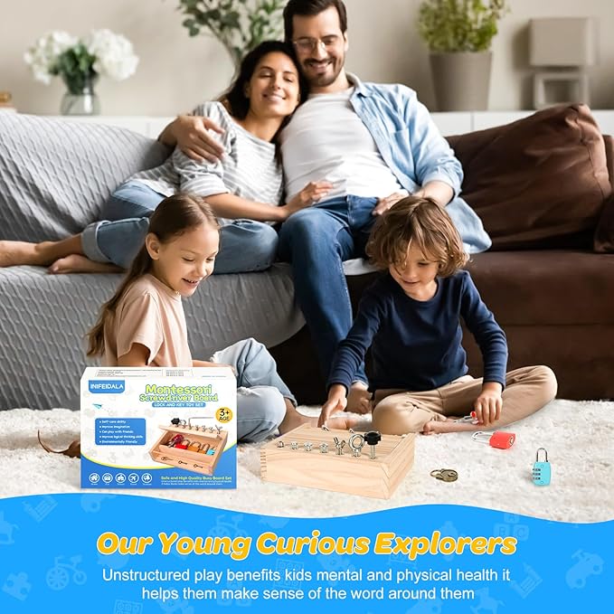- Montessori Busy Board: Our INIFEIDALA Montessori Screwdriver Board Lock and Key Set is designed to turn a boring learning process into a creative and fun one. This toy for toddlers ages 3+ will help toddlers gain fun and confidence as they learn the real-life skills of using a screwdriver, using a variety of locks, and holding keys correctly while playing. It also helps push young children to explore and problem-solve. Also trains hand-eye coordination and develops their fine motor skills