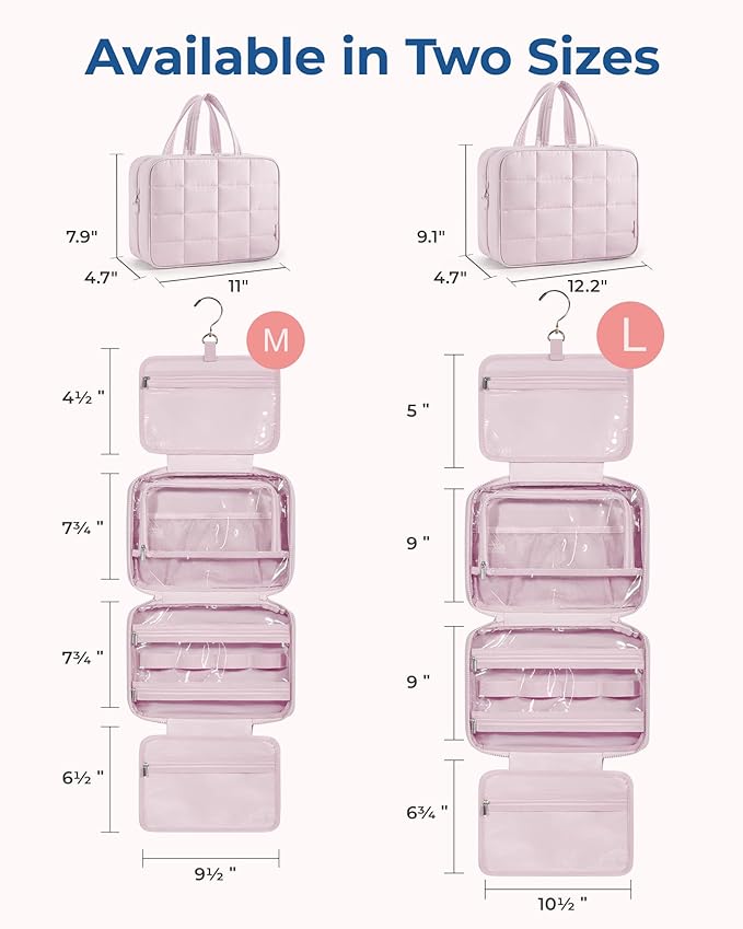 - Large Capacity: Medium size - 11''L x 4.7''W x 7.9''H(closed). Large size - 12.2''L x 4.7''W x 9.1''H(closed). The travel toiletry bag can perfectly organize your necessary travel toiletries and makeup storage
