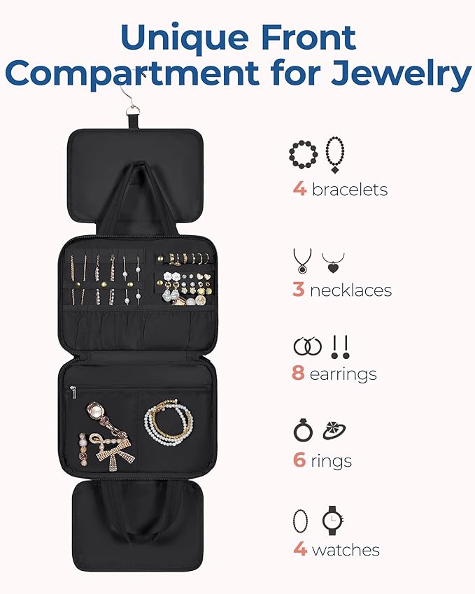 - 𝐉𝐞𝐰𝐞𝐥𝐫𝐲 𝐂𝐨𝐦𝐩𝐚𝐫𝐭𝐦𝐞𝐧𝐭: Bagsamrt toiletry bag is design with jewelry organizer compartment. Adding a compartment in the front pocket of travel bag for rings, ear rings, bracelets, bangles, necklaces, and other jewelries, meeting your travel toiletries and makeup needs