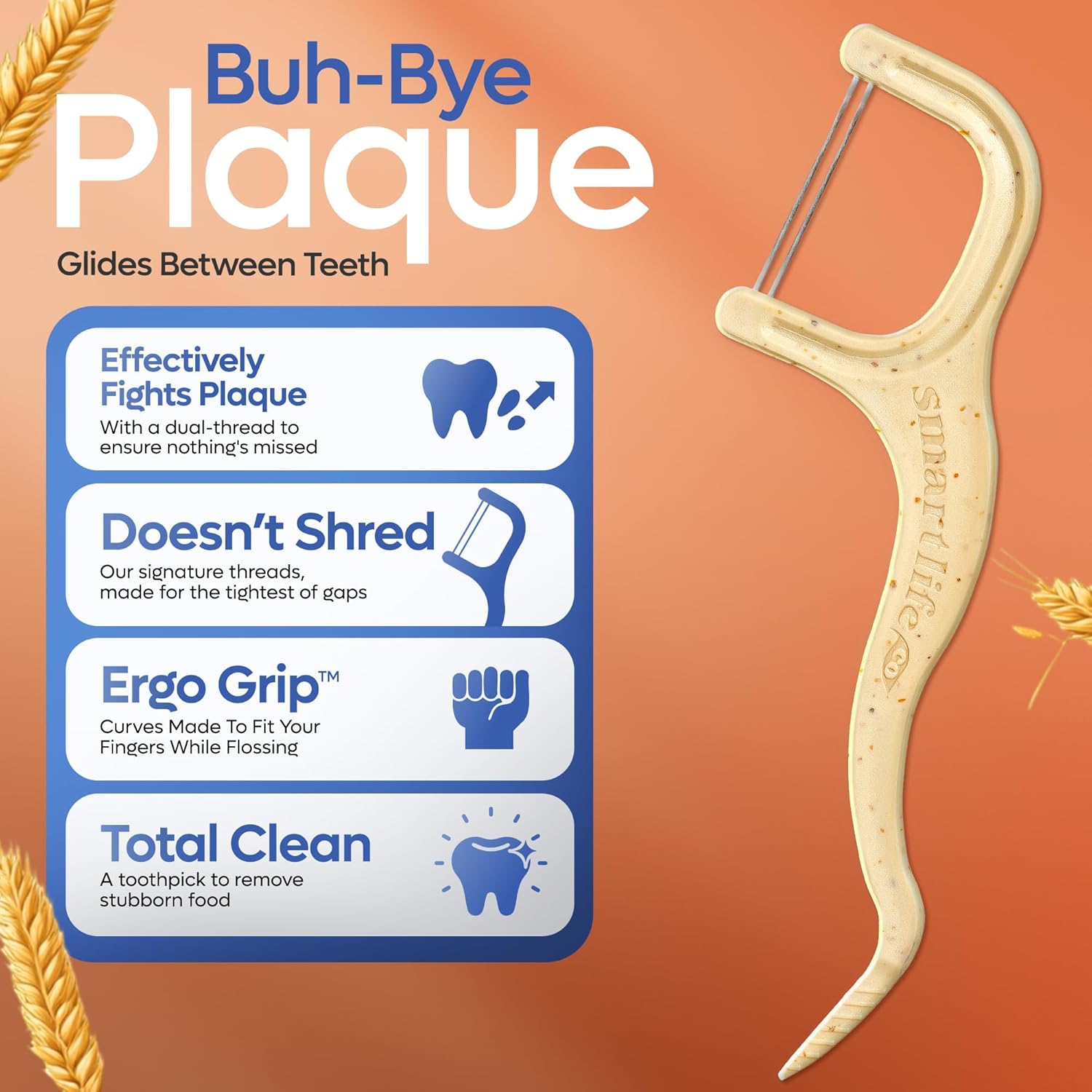 SmartLifeco Eco-Friendly Dual-Thread Dental Floss Picks (200ct) - Flossers Made with Straw Wheat Blend, Proven Anti-Shred for Tight Gaps, Tooth Pick Stick for Adults, Soft on Gum & Teeth, Unflavored