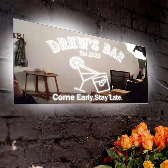 - ♥【FANTASTIC GIFT】: The perfect Mother's Day, Christmas or birthday present! This stunning personalised name mirror sign with LED multi colour lighting is the perfect addition to any kid's Bars, barbershops, beauty salons, games (or adult, business).Our custom LED name mirror signs for bar decor is a thoughtful gift for a friend or loved one with a new home or apartment. These custom LED signs make great gifts for teen girl Bars, barbershops, beauty salons, games decor or a neon gamer sign.