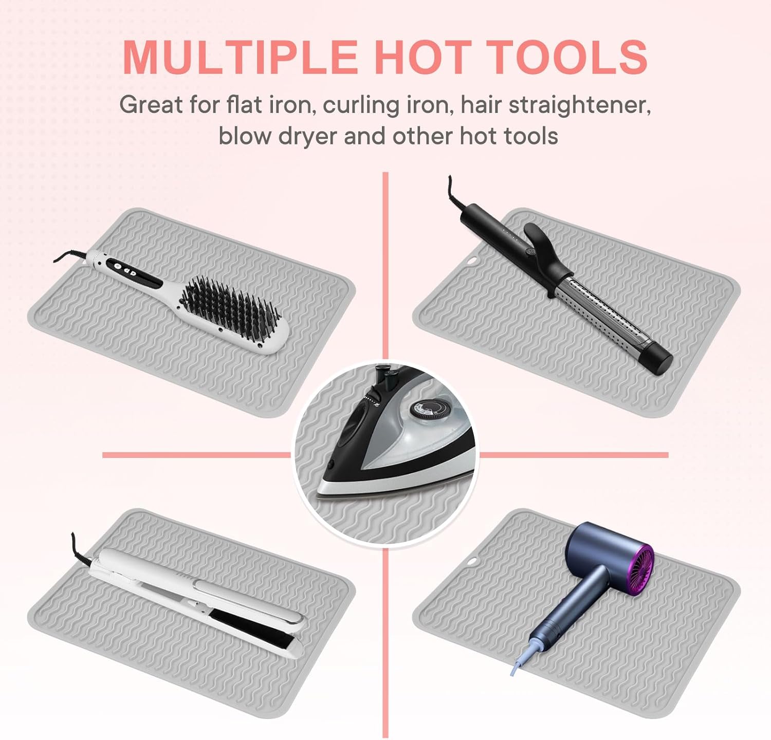 - ANTI-SCALD PROTECTION: This silicone heat resistant mat for hair tools safeguards any type of delicate surfaces from heat damage of curling irons, flat irons, hair straightener, curling wand, hot air brush and other hair styling tools appliances and protect your family and children from contact burns and thermal injuries
