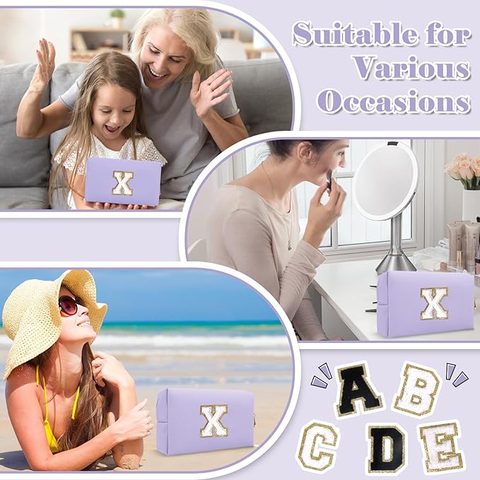 Personalized Makeup Bag Initial A-Z Preppy Patch Bag,Small PU Leather Travel Cosmetic Bag Pouch with Zipper,Purple Cute Toiletry Bag,Gift Ideal for Teen Girls Women Birthday Friend Mom,Latter X
