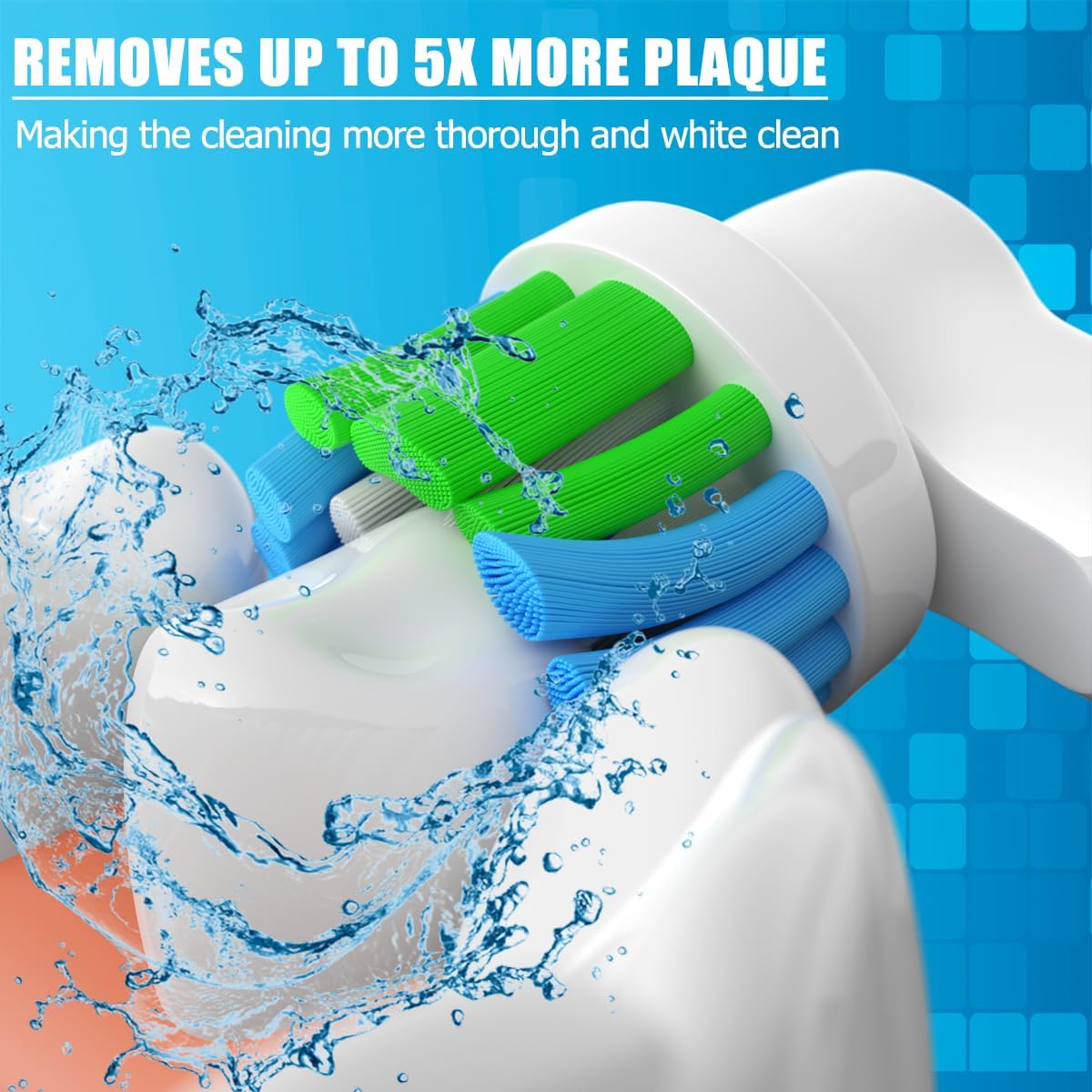 - 4*Efficient Replacement Heads: The efficient replacement heads use blue bristles that protrude from the upper and lower parts to deeply remove dental plaque in difficult to reach areas. The light green bristles in the middle of the brush head can easily remove stains on the tooth surface, increasing cleaning efficiency by three times compared to a regular toothbrush head.