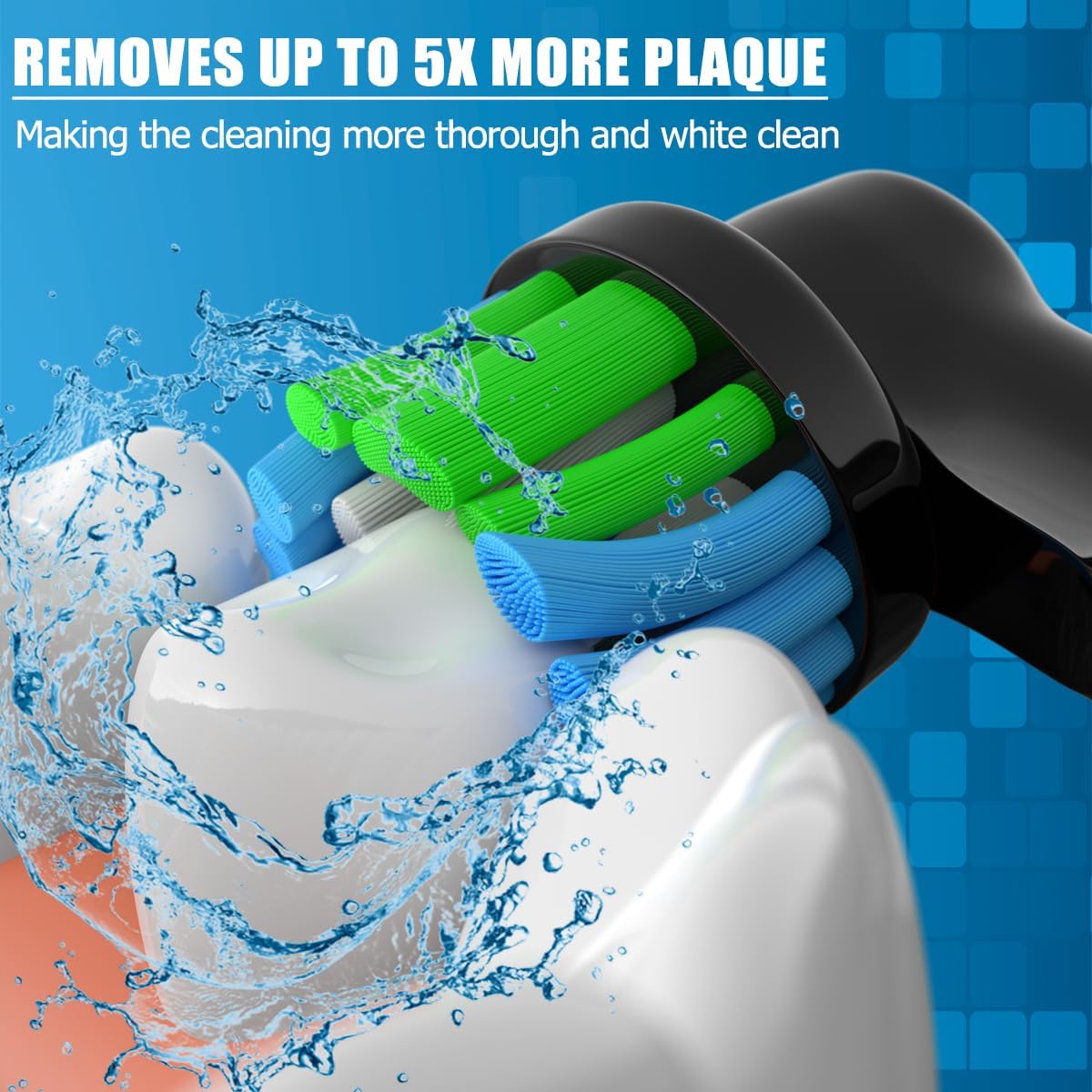 - 2*Precision Replacement Heads: The bristles of the precision replacement heads can wrap the teeth in all directions, and perform Tooth-by-Tooth cleaning. The green bristles on the periphery can deeply clean the gaps between teeth.