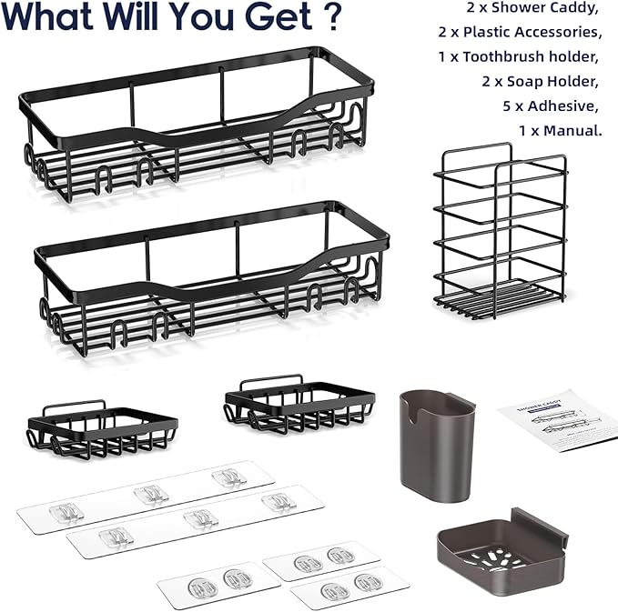- What Will You Get: 2 x black shower caddy, 1x toothbrush holder, 2x soap holder, 2 x plastic accessories, 5 x adhesive, 1x manual. The bathroom organizer shelf ideal for all your washing essentials such as shampoos, facial cleansers, loofahs, kids bath toys, razors, a sleek and functional addition to your bathroom organization. If you have any problems, please feel free to contact us, we will provide satisfactory solutions