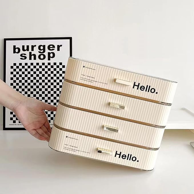 - ➣【Stackable Design】The stackable design allows for more items in a limited space, keeping the cluttered countertops in order. Both the top tray and the bottom of the drawer box have 4 non-slip feet, and the top of each drawer box is recessed so that either the tray or the box can be stuck on the drawer box below. A beautiful and excellent organizer that keeps your desktop clean and tidy.