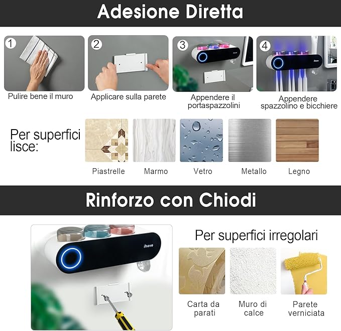 iHave Wall Mounted Electric Toothbrush Holders with 3 Cups, UV Sanitizer, Toothpaste Dispenser, Smart Home Bathroom Accessories & Decor, Black